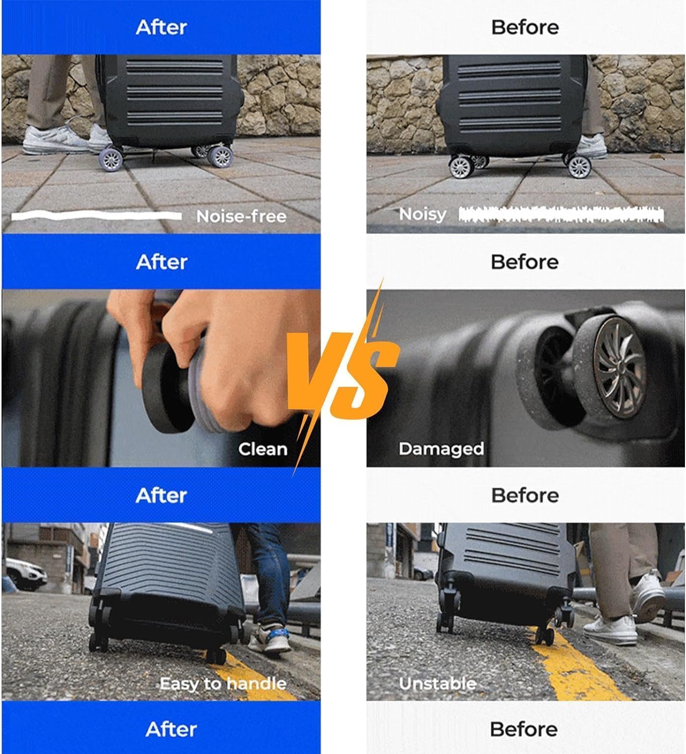 Idéal pour les déplacements en avion, train ou voiture, ces protecteurs réduisent le bruit des roues sur les sols durs comme les aéroports ou les gares. Ils sont parfaits pour les voyages d’affaires ou les vacances, où les valises sont souvent manipulées et exposées à l’usure. Utilisez-les également pour le stockage prolongé, afin de maintenir les roues en parfait état.
